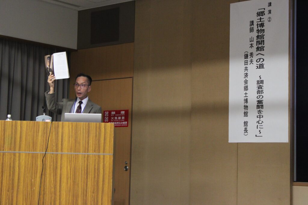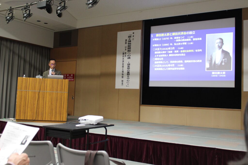 次に当館館長による「郷土博物館への道 ~調査部の奮闘を中心に~」です。調査部は共済会郷土博物館開館に先立ち、1922(大正11)年に設置されました。その活動は調査研究・史料収集・陳列(展示)と現在の博物館活動と遜色ない活発な動きをしており、郷土博物館開館にも生かされていたことを、当時の資料をもとに説明しました。最後には、調査部・郷土博物館主事として全ての事業を牽引した岡田唯吉の「専門家はもちろん一般人が何度も喜んで見て、知人をも連れ出して見に来るようなところにしたい」という言葉を紹介し、これは現在の私たちの目標でもあるとして締めくくりました。