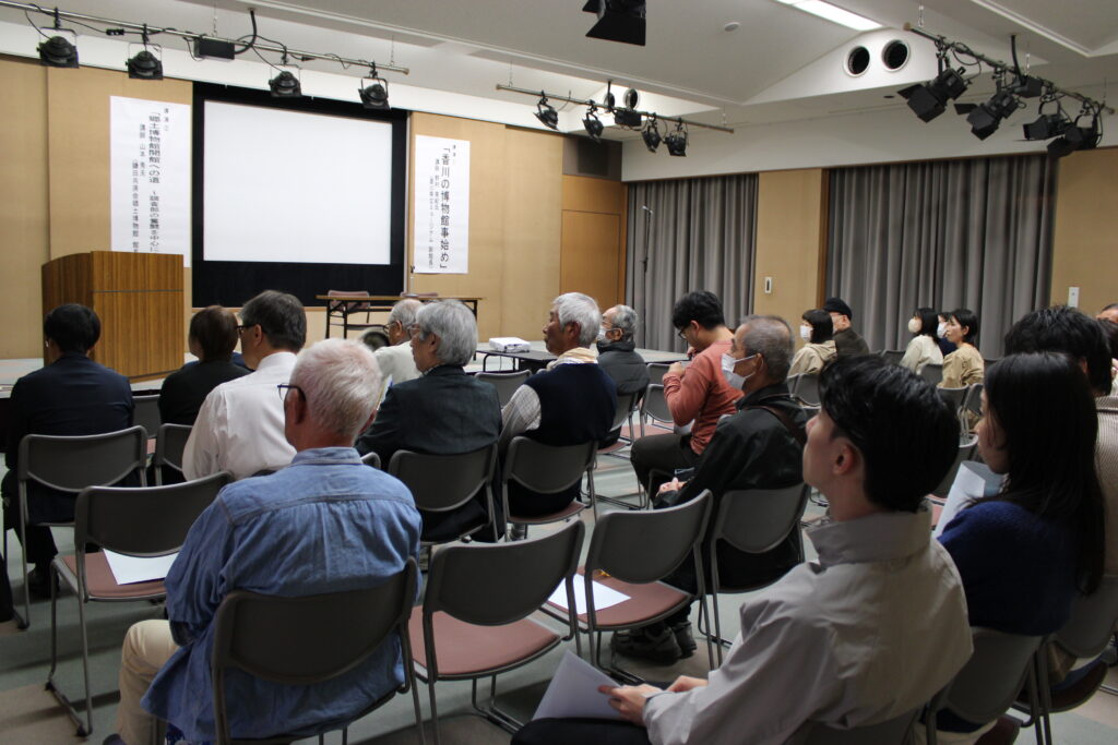 はじめに野村様より「香川の博物館事始め」と題しご講演をいただきました。昭和初期の県内博物館施設として、鎌田共済会郷土博物館のほか、金刀比羅宮をはじめとする社寺宝物館や高松高等商業学校附属商業博物館といった専門博物館、動物園などがあり、多様な館種があったこと、全国的にみても館数が多いことが特徴といえることがわかりました。また、県内初の博物館である香川県博物館(現 商工奨励館)について、資料収集や展示の様子、「美術館」としての機能や物産陳列のことなど、具体的な資料を挙げながら詳しくご紹介いただきました。